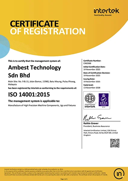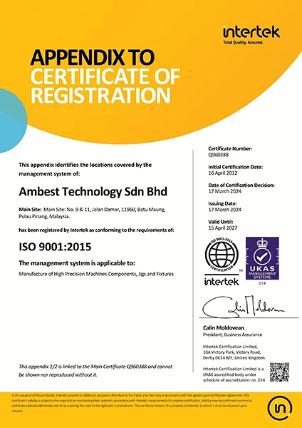The Management of AMBEST, a manufacturer of high precision machining components, jigs and fixtures, is committed to produce products that meets Customer as well as other applicable regulatory requirements through continual improvement of the Quality Management System with the end in mind of enhancing Customer satisfaction.